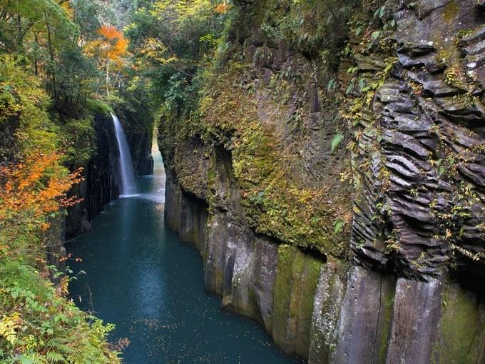 Ở Nhật Bản có rất nhiều địa điểm để chiêm ngưỡng màu lá mùa thu, trong đó có hẻm núi Takachiho ở vùng Miyazaki. Cách tốt nhất để xem những tán lá mùa thu phủ dày đặc khắp khu vực là thuê một chiếc thuyền chèo tay. Hành trình đi qua những thác nước sương mù, vách đá dốc, các tảng đá lởm chởm giữa sắc vàng mùa thu sẽ là trải nghiệm khó quên với du khách khi đến hẻm núi này. Ảnh: cntraveler.