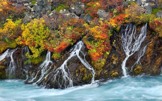 Iceland nổi tiếng với suối nước nóng, những vùng nham thạch và phong cảnh ấn tượng. Vào mùa thu, đây cũng là điểm đến hàng đầu để ngắm những chiếc lá rực rỡ màu đỏ, vàng và cam. Đến Hraunfossar, một loạt thác nước trải dài gần một cây số trên những bậc thang khổng lồ hình thành từ dung nham cổ xưa sẽ mang đến cho bạn trải nghiệm rất ấn tượng. Ảnh: TravelAndLeisure.