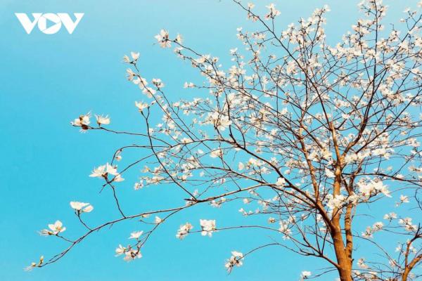 Bông ban trắng tinh khôi, pha chút phớt tím nổi bật trên nền trời trong xanh.