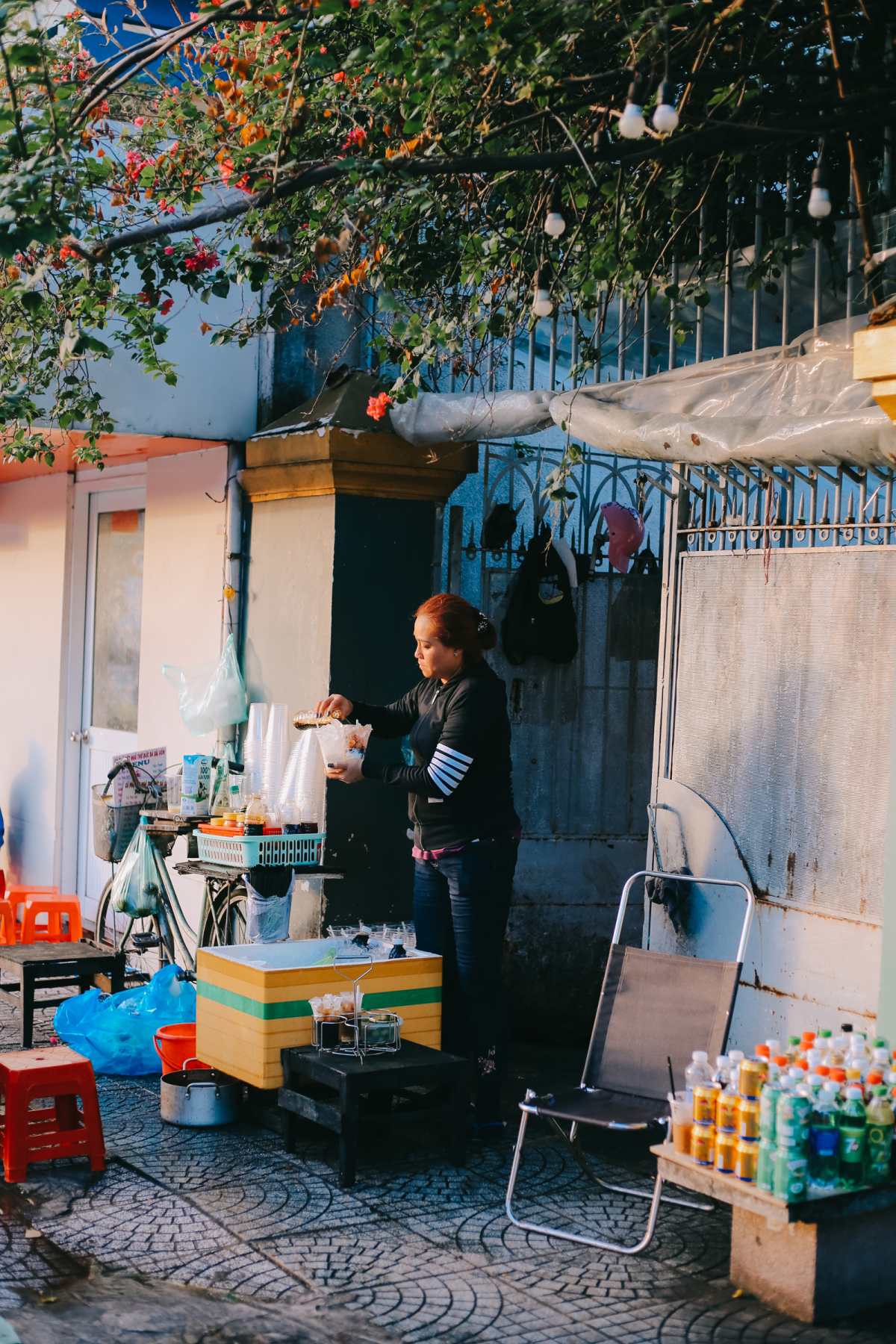 "Sáng sớm trên đường Đinh Tiên Hoàng, quận 1, người dân lao động đã đi làm từ sớm tinh mơ với một phần bánh mì hoặc tô bún, phở nóng hổi đặt trên ghế nhựa. Chợ mở cửa chào đón hàng rau, hàng cá, tạp hóa... Đến khoảng 7h, đường phố bắt đầu nhộn nhịp", Hiếu kể.
