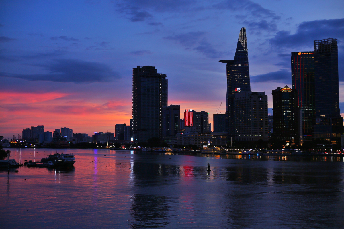 Hoàng hôn màu hồng trên sông Sài Gòn chụp từ cầu Thủ Thiêm 2. Du khách có thể trải nghiệm nhiều hoạt động khác nhau trên sông như: chèo SUP chi phí khoảng 250.000 đồng một người, ngắm hoàng hôn, ăn tối trên sống bằng du thuyền giá vé từ 260.000 đồng đến 1,3 triệu đồng một người.