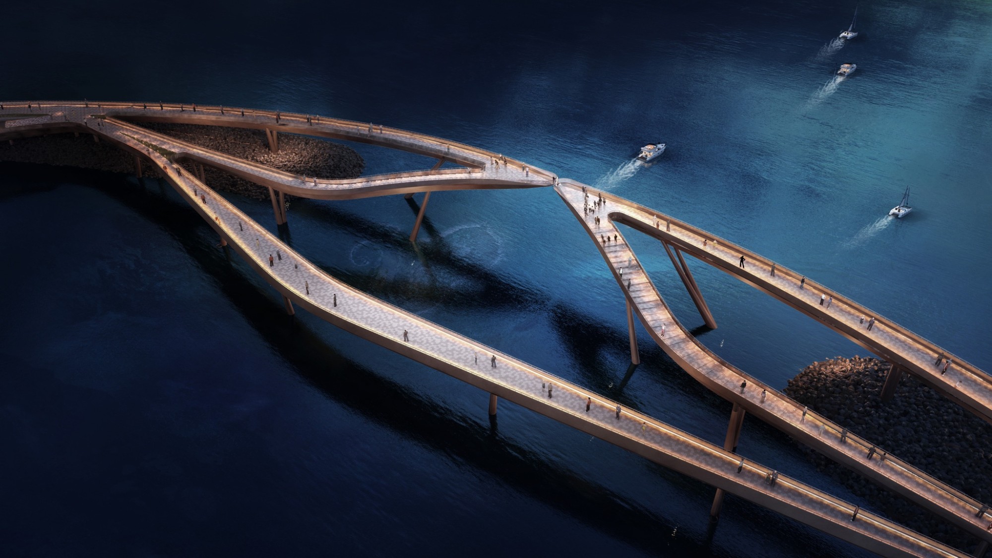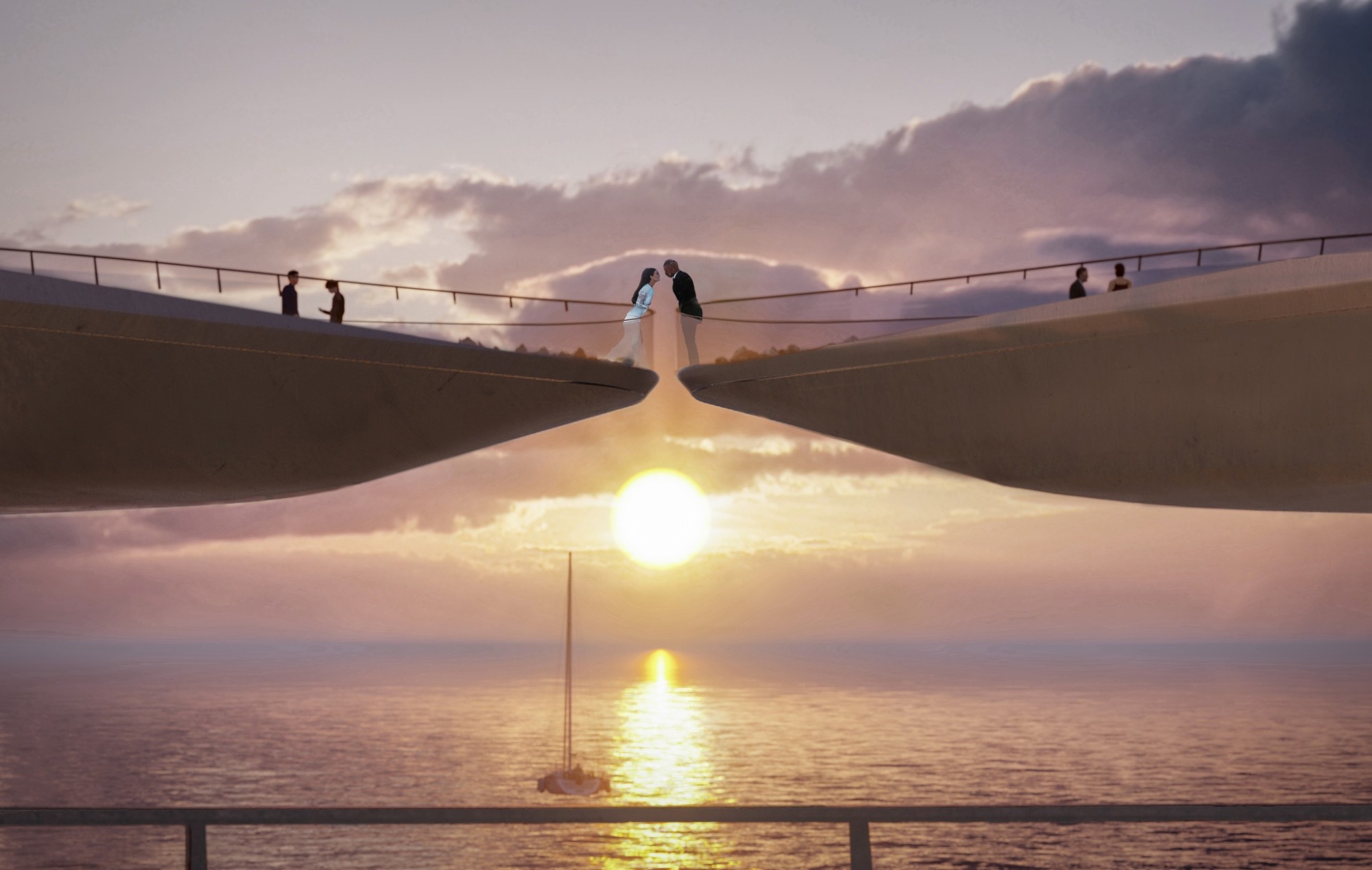Một trong những điểm đặc biệt nhất của công trình là các kỹ sư, kiến trúc sư đã khéo léo tính toán để "nút chạm" của cây cầu cũng chính là điểm đón hoàng hôn trên đại dương. Lúc này, mặt trời sẽ từ từ hạ xuống, hiện hữu chính giữa cầu, "rơi" đúng qua khoảng trống 50 cm của hai cánh cung lớn trước khi chìm xuống đáy biển.