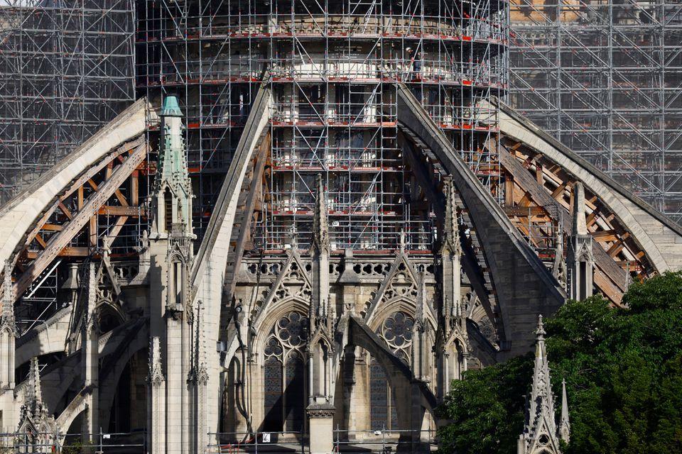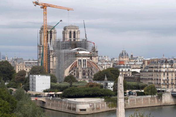 Trận hỏa hoạn năm 2019 đã làm sập một tòa tháp và thiêu rụi phần mái của nhà thờ. Ảnh: Politico Bà Abdul Malak cho biết giai đoạn dọn dẹp của dự án trùng tu đã kết thúc và công cuộc xây mới những phần hư hỏng sẽ được tiến hành vào cuối mùa hè này.