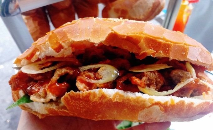 Chiếc bánh mì giòn kết hợp nhiều loại nhân như xíu mại, chả cá, thịt heo quay, bì... được nhiều người ưa chuộng.