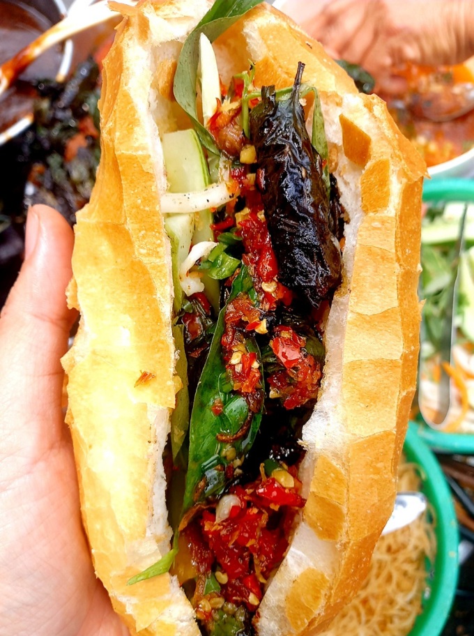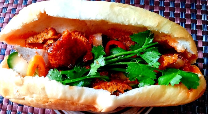 Đây cũng là một trong những món ăn chiếm được cảm tình của nhiều thực khách. Món ghi điểm nhờ lớp vỏ bánh giòn và phần nhân là những lát thịt heo quay giòn bì. Người bán sẽ thêm vài lát dưa leo, đồ chua, ngò, ớt chan nước sốt...