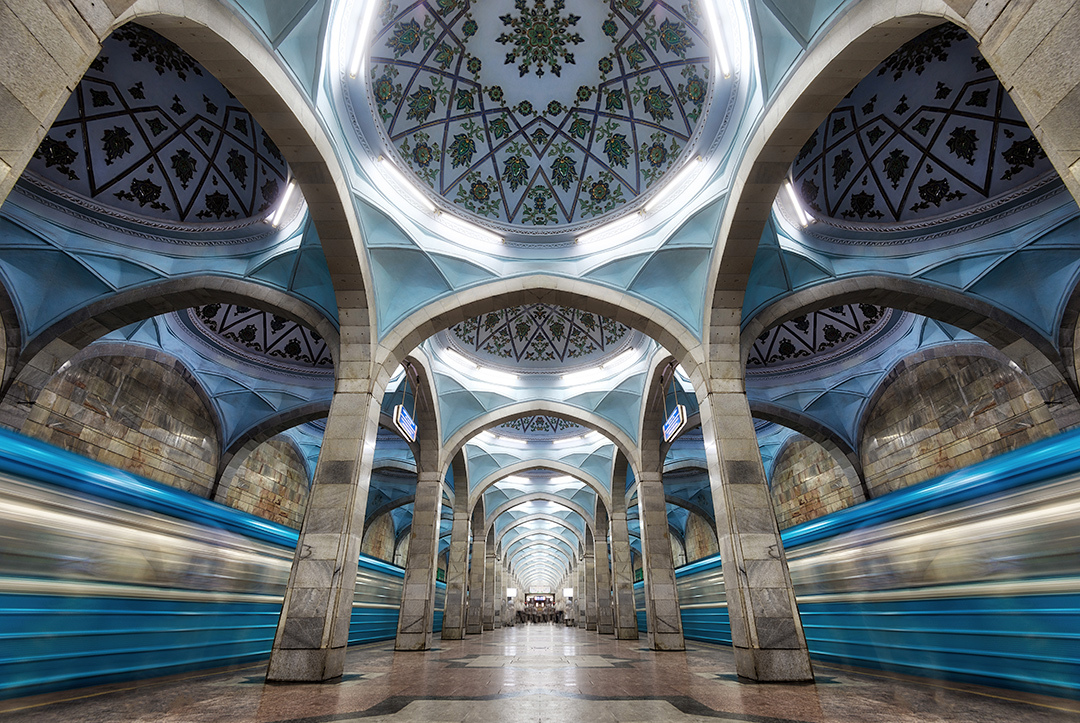 Hệ thống tàu điện ngầm ở Tashkent là lâu đời nhất Trung Á, một kiệt tác bao gồm các cột tráng men, những trần nhà được trang trí họa tiết cầu kỳ, gây ngạc nhiên cho cả những du khách khó tính. Ảnh: LHM