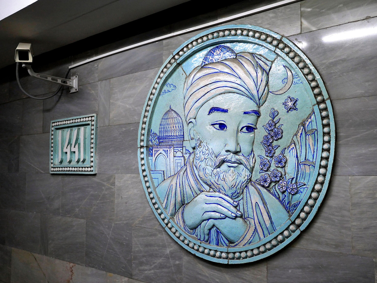 Các ga tàu điện được trang trí theo phong cách khác nhau, điển hình là ga có bức phù điêu một con chim hùng vĩ được quây bởi một vòm nhọn Arab, kỷ niệm Tashkent 2.200 tuổi. Tại ga Pakhtakor, đó là một bức tranh khảm có tông màu xanh làm nổi bật những sợi bông nở ra từ thân cây cam, ám chỉ một trong những ngành công nghiệp chính của nước này. Trong ảnh là bức điêu khắc Alisher Navoi, một trong những người bắt đầu truyền thống thơ ca của người Uzbekistan. Ảnh: Amos Chapple/RFE/RL