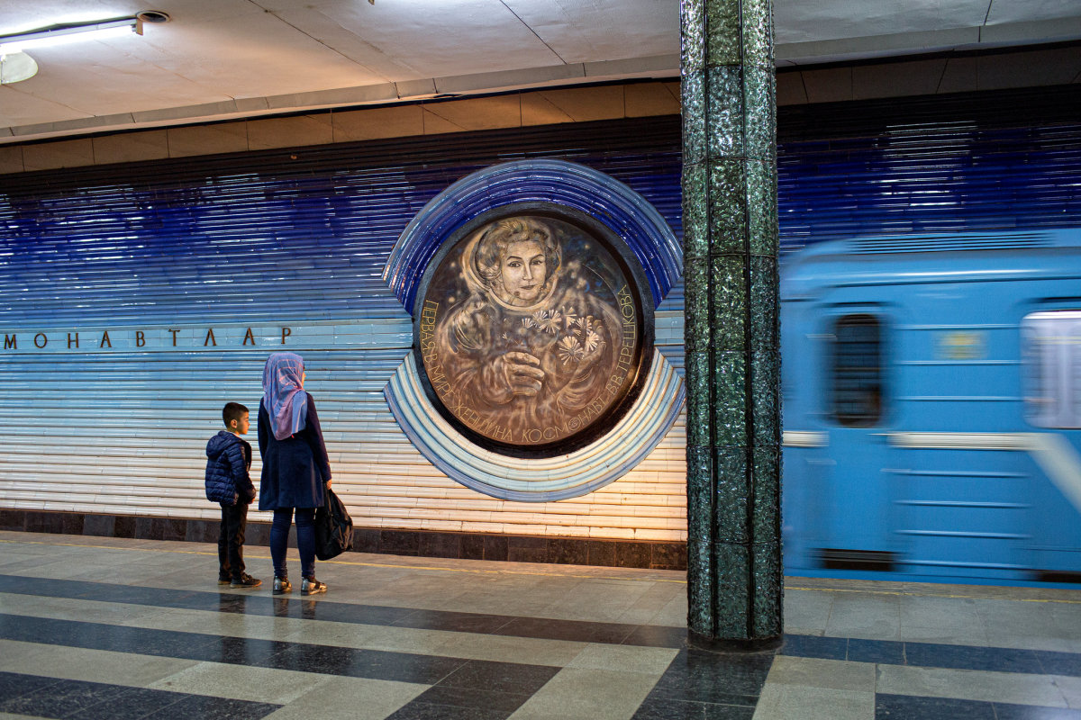 Ga Kosmonavtlar nổi tiếng nhất, tôn vinh những thành tựu khoa học của đất nước với chân dung của các phi hành gia nổi tiếng. Họ được điêu khắc với phong cách vừa hiện thực vừa cổ tích. Tại đây, phong cách Liên Xô hòa trộn các ảnh hưởng Hồi giáo, thể hiện thẩm mỹ độc đáo của người Uzbekistan. Ảnh: Danielle Villasana