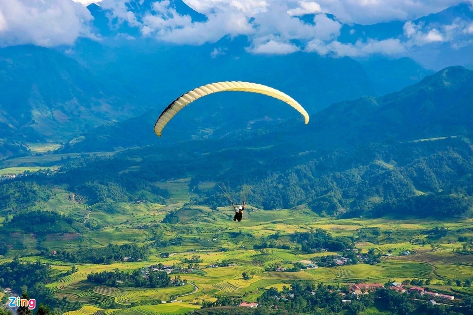 Du khách trải nghiệm cảm giác bay dù lượn, ngắm cảnh từ trên cao. Ảnh: Hồng Quang. Tại Tây Bắc, du khách còn có thể trải nghiệm tuyến zipline kéo dài 1,2 km nối liền 2 huyện Văn Chấn và Mù Cang Chải của tỉnh Yên Bái.