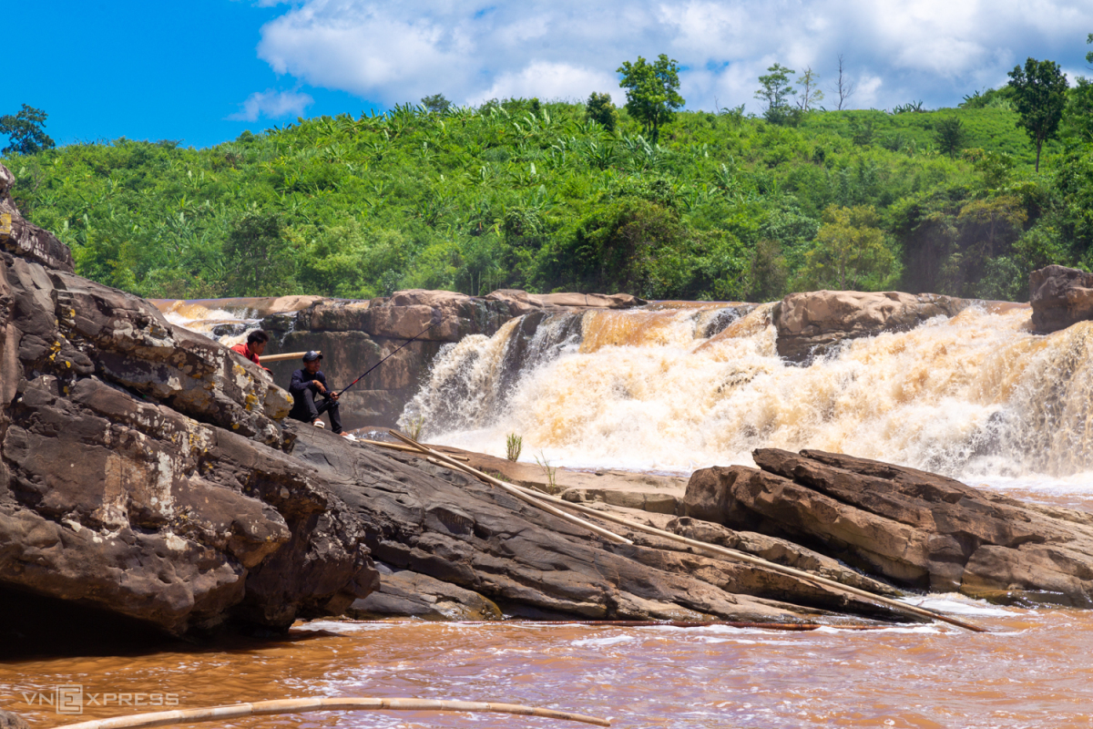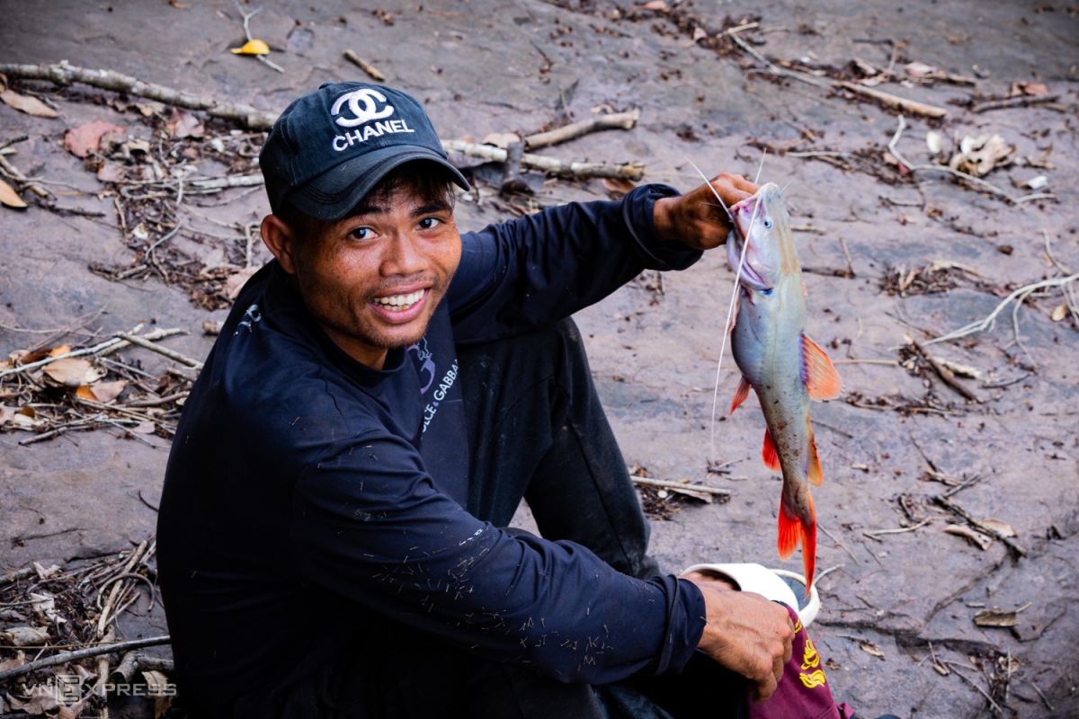 Một con cá lăng khá to câu được giữa dòng thác A Dơi. Anh này cho hay từng câu được cá nặng 8 kg ở con thác này.