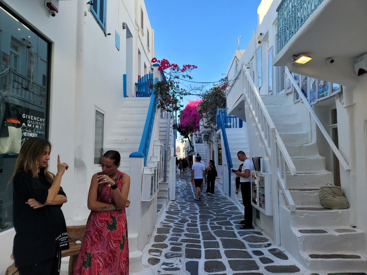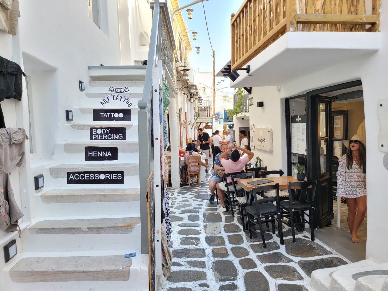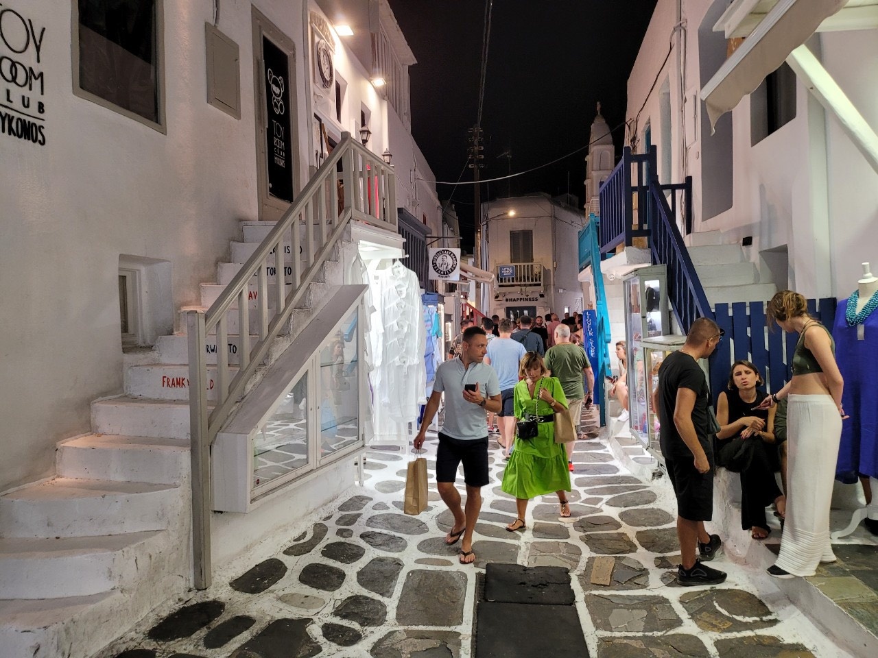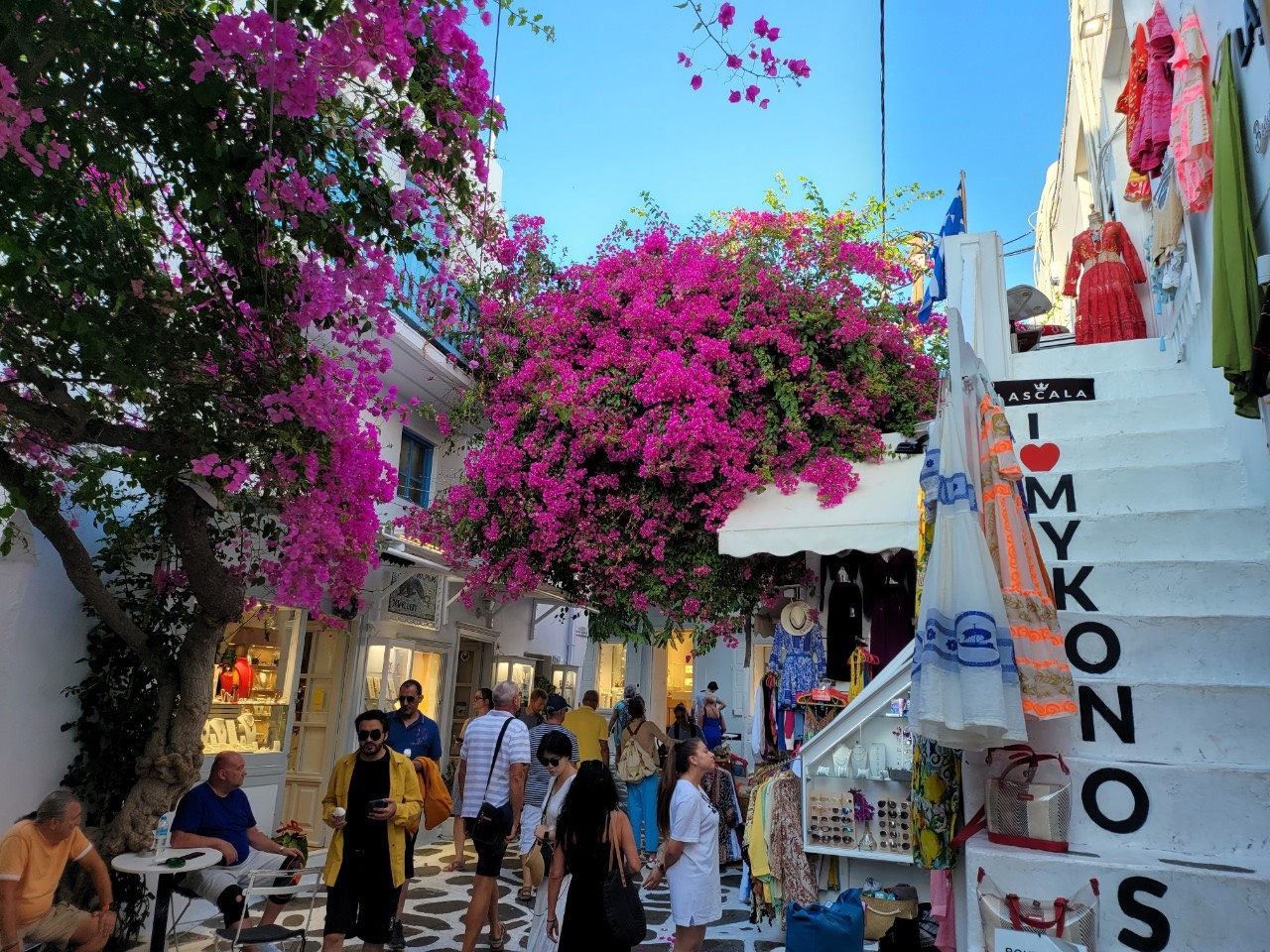 Con phố Matoyianni ở Chora là nơi thu hút đông đúc du khách nhất trong suốt mùa hè Mykonos. Nơi này có rất nhiều cửa hàng lưu niệm, tiệm bán đồ nữ trang handmade và shop thời trang thiết kế. Các con hẻm nhỏ, sạch sẽ và ngăn nắp. Trong ảnh là một cửa hiệu có dòng chữ "I love Mykonos" viết trên bậc cầu thang nằm bên ngoài căn nhà, nét đặc trưng của điểm đến. Nhiều tờ báo du lịch trên thế giới xếp Mykonos vào danh sách những điểm đến đẹp nhất thế giới vì có bãi biển cát vàng, làn nước trong xanh, khu phố đặc trưng khác biệt với những ngôi nhà có cầu thang trước cửa. Nhưng không chỉ thế, Mykonos còn có cuộc sống về đêm sôi động không ngủ.