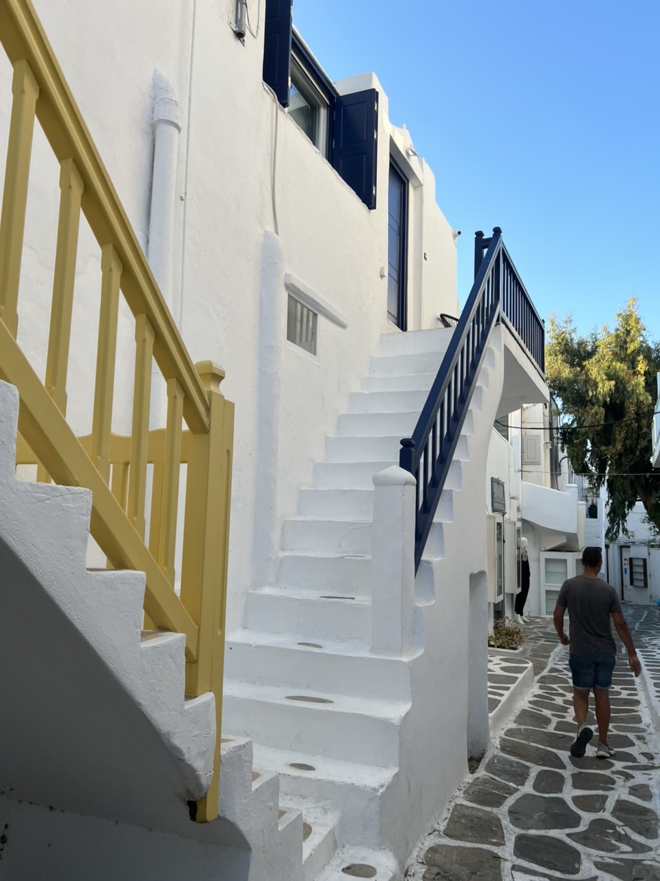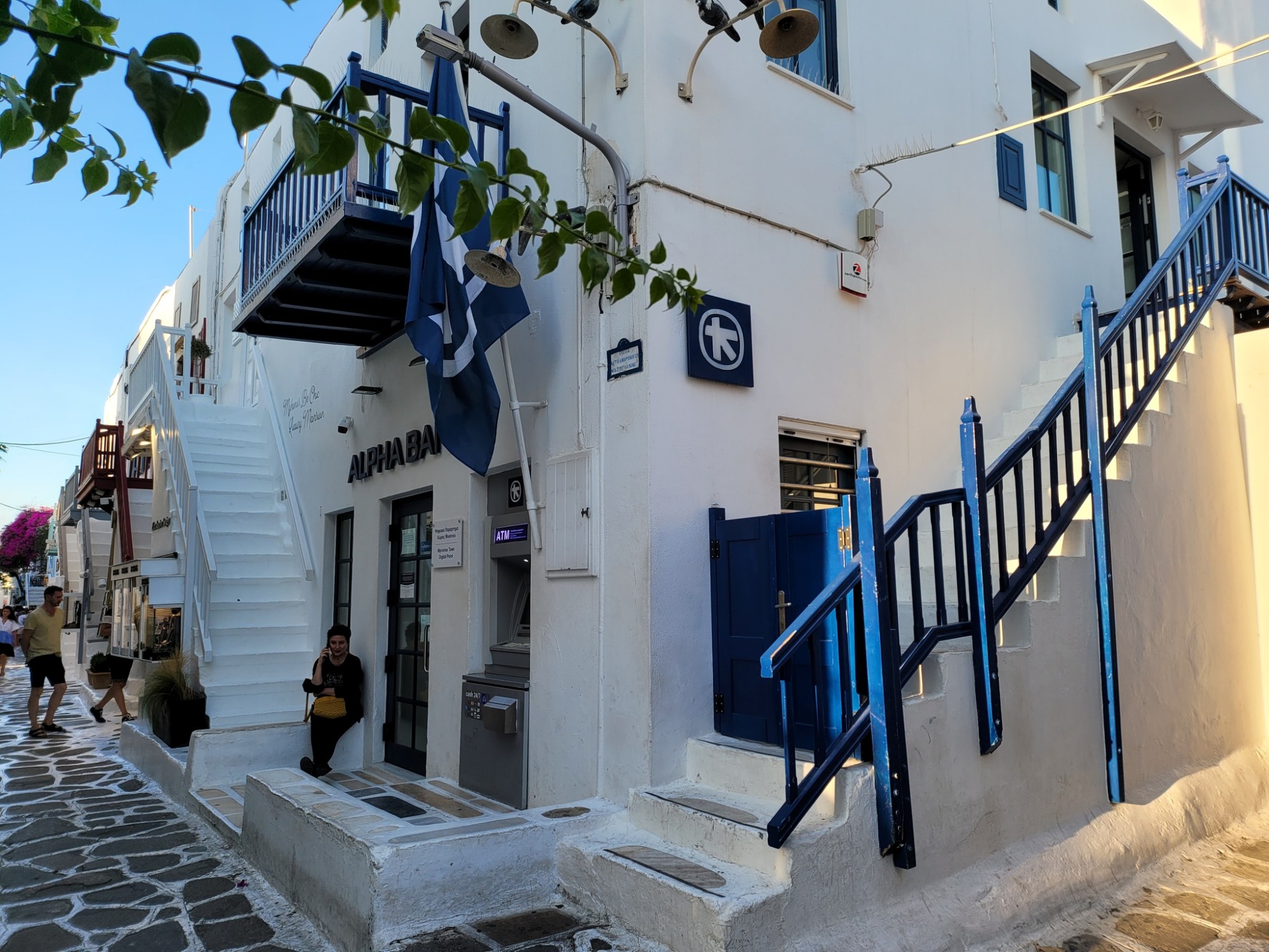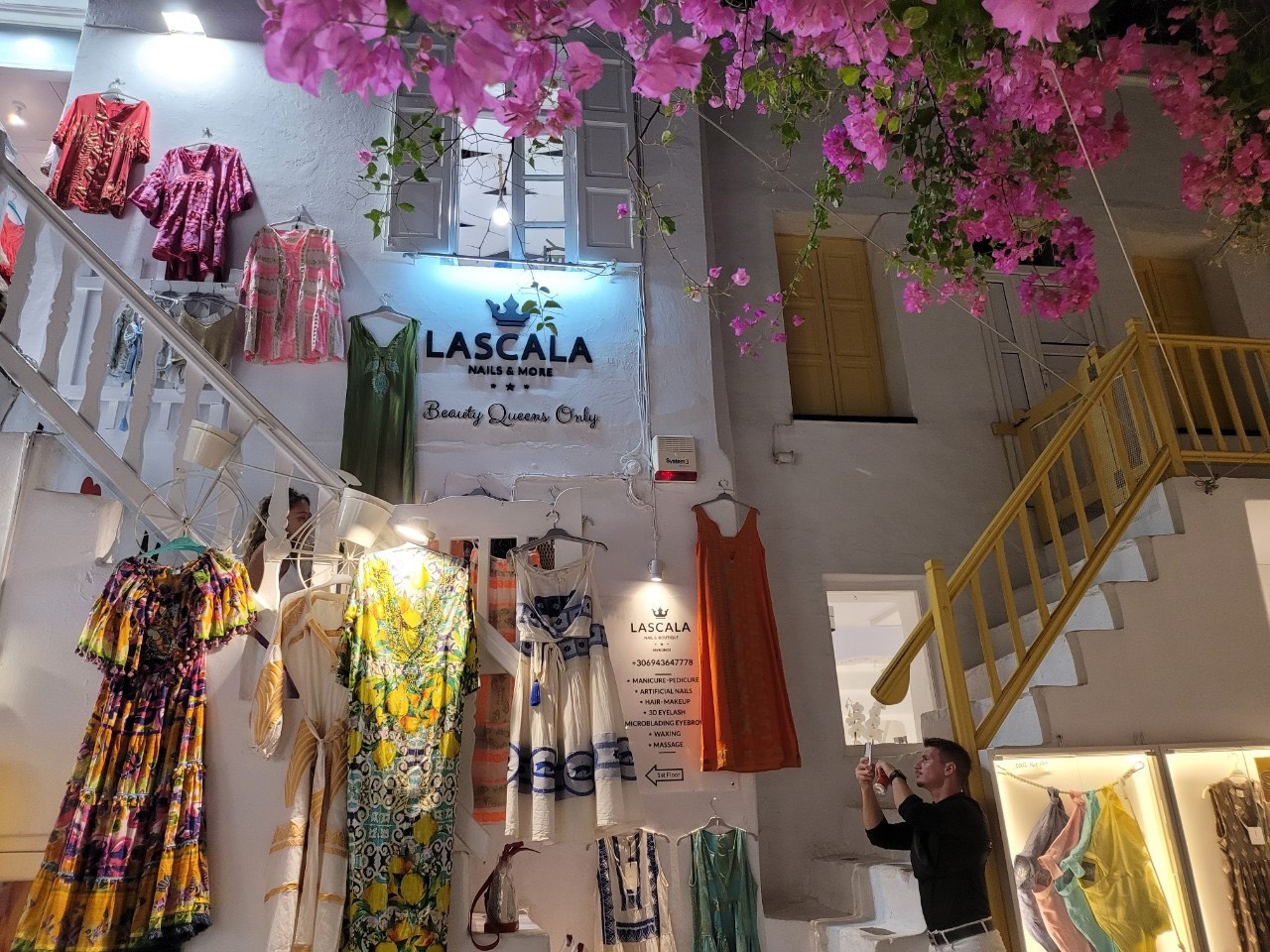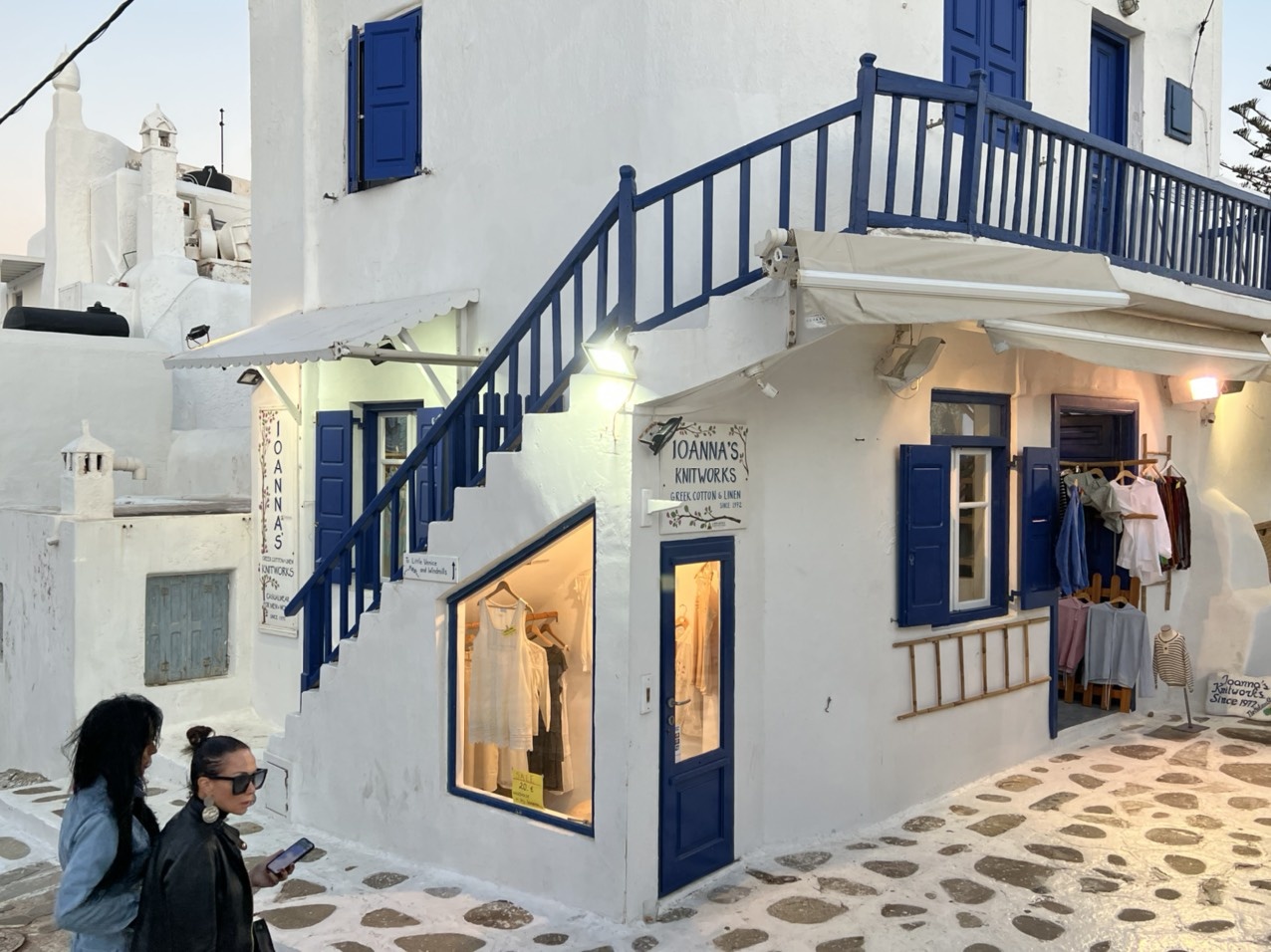 Con phố Matoyianni ở Chora là nơi thu hút đông đúc du khách nhất trong suốt mùa hè Mykonos. Nơi này có rất nhiều cửa hàng lưu niệm, tiệm bán đồ nữ trang handmade và shop thời trang thiết kế. Các con hẻm nhỏ, sạch sẽ và ngăn nắp. Trong ảnh là một cửa hiệu có dòng chữ "I love Mykonos" viết trên bậc cầu thang nằm bên ngoài căn nhà, nét đặc trưng của điểm đến. Nhiều tờ báo du lịch trên thế giới xếp Mykonos vào danh sách những điểm đến đẹp nhất thế giới vì có bãi biển cát vàng, làn nước trong xanh, khu phố đặc trưng khác biệt với những ngôi nhà có cầu thang trước cửa. Nhưng không chỉ thế, Mykonos còn có cuộc sống về đêm sôi động không ngủ.