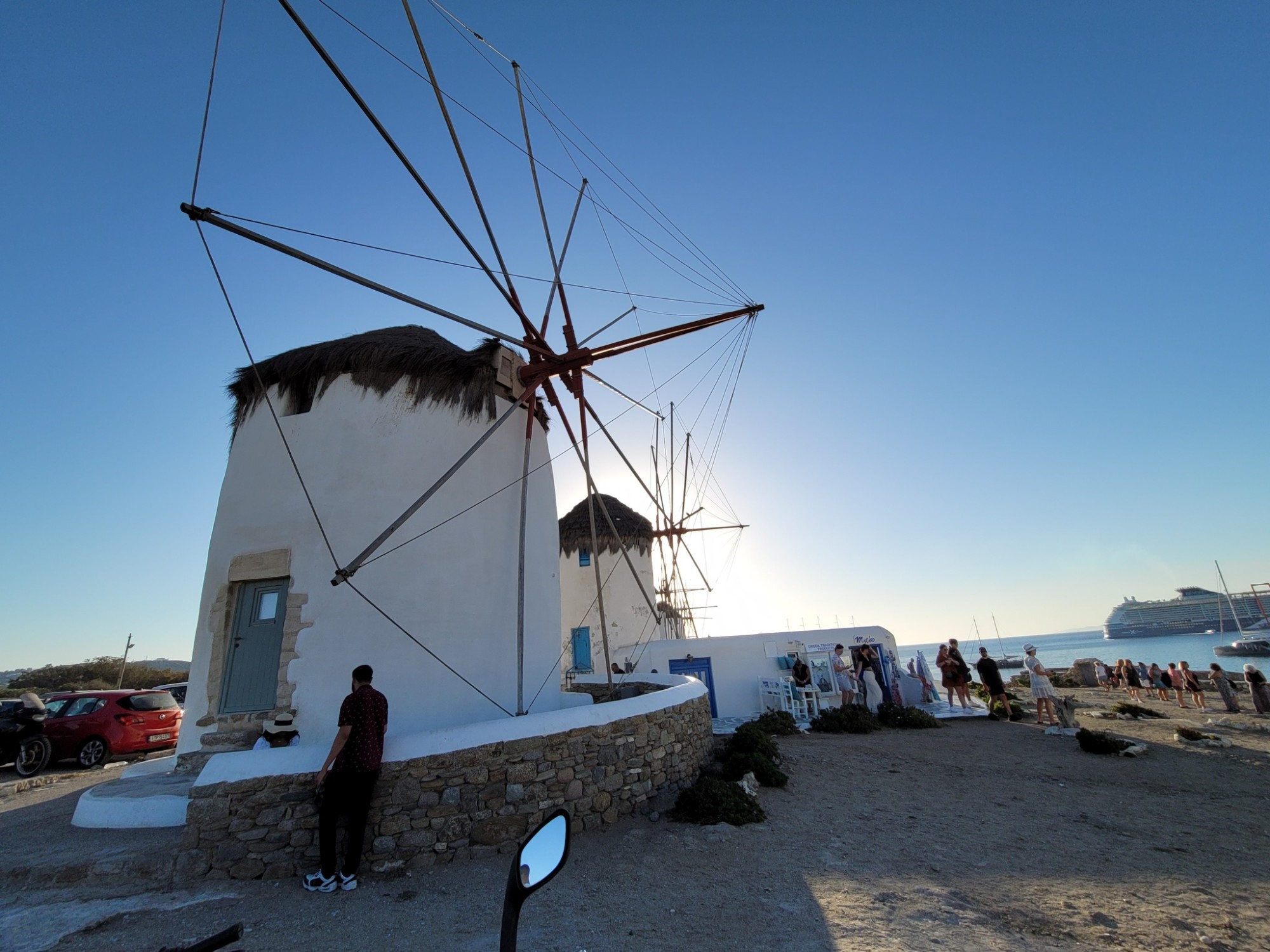 Điểm đặc trưng của nơi này là cầu thang lên tầng hai của căn nhà đều nằm trước cửa. Ngay cầu thang, chủ cửa hiệu treo các sản phẩm chào bán cho du khách. Ở Mykonos cũng như nhiều đảo khác trong cụm đảo Cycladic, gió rất lớn vì thế, những cối xay gió được xây dựng bởi người Venetians (người Venice, Ý) từ thế kỷ 15 -16 vẫn còn tồn tại. Nhiều cối xay gió đã đóng cửa và chỉ còn 16 - 28 cái còn hoạt động ở Mykonos. Từ trên đỉnh đồi, du khách có thể quan sát được cả khu phố cũ nhộn nhịp ngày nay.