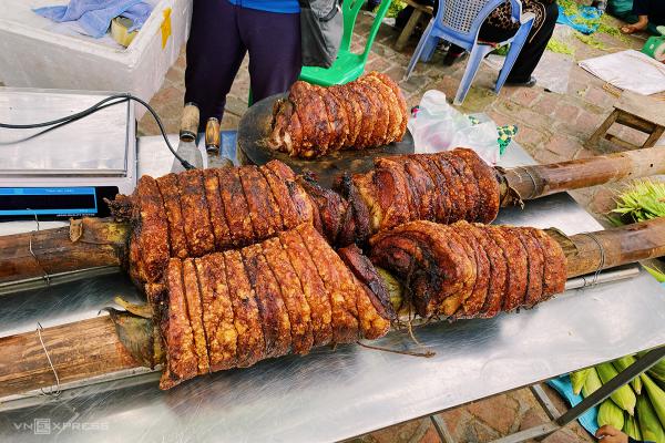 Thịt quay đòn gánh với lớp bì vàng ươm, giòn rụm, bắt mắt mọi thực khách ghé thăm phiên chợ sáng tại Đường Lâm - Ảnh: Trung NghĩaMiếng thịt heo được chọn để quay phải là loại ba chỉ ngon, tươi, có lớp da dày nhưng lại không được quá nhiều mỡ. Thịt được tẩm ướp với những gia vị như húng lìu, hạt tiêu, hành tươi, mắm muối... Một trong những nguyên liệu làm nên sức hấp dẫn của thịt quay đòn gánh Đường Lâm là lá ổi. Lá ổi non được băm nhỏ, ướp với thịt khoảng một tiếng, trong khi phần lá bánh tẻ lót vào miếng thịt trước khi đem đi quay. Sau khi được tẩm ướp xong xuôi, thịt được cuốn gọn vào một chiếc đòn tre đã lót lá chuối bên trong.