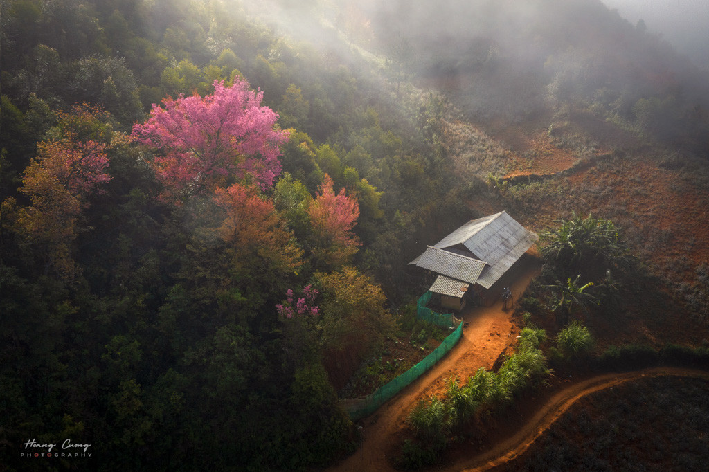 Nhìn từ xa, những ngôi nhà trình tường như chìm trong làn sương hồng mờ ảo.