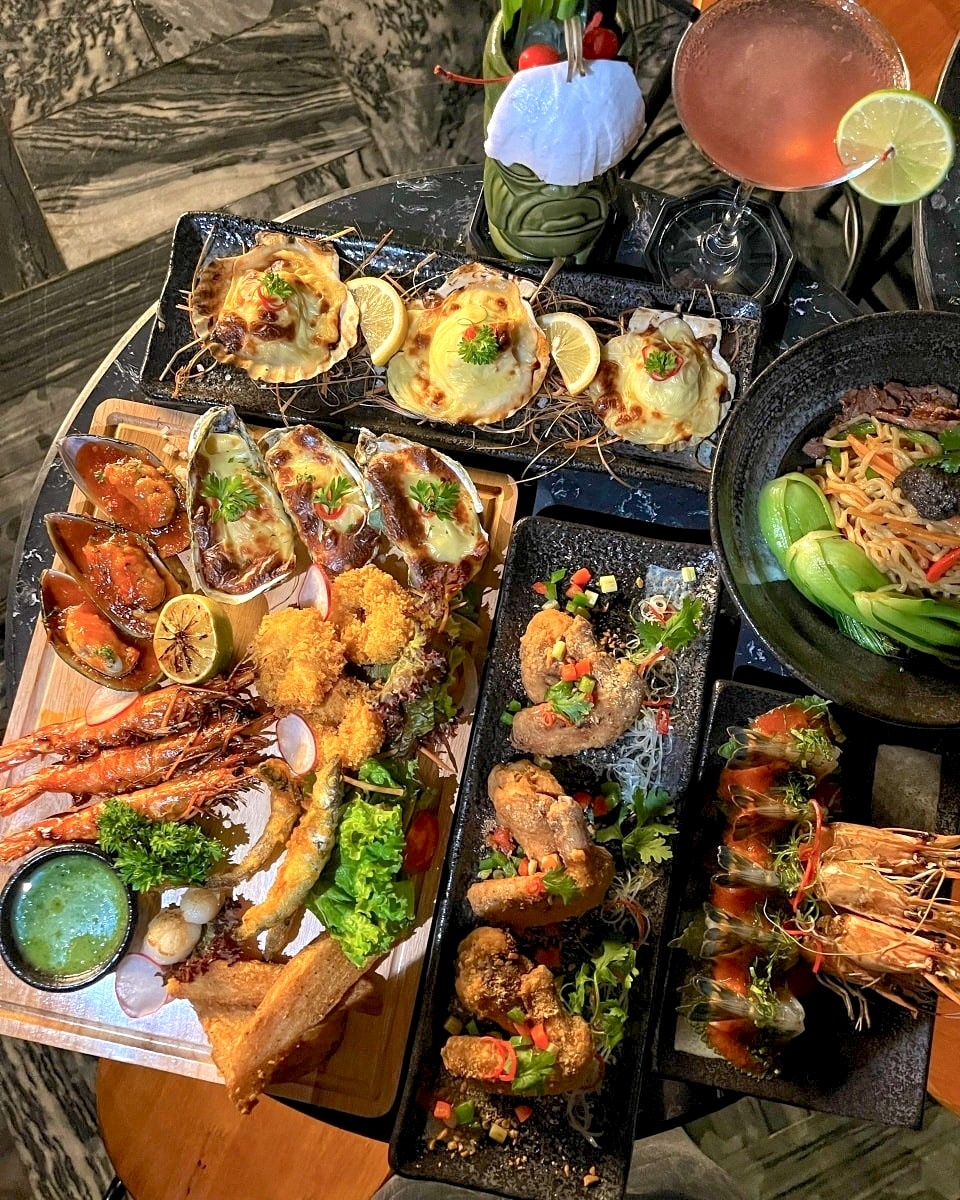 - Thực đơn phong phú với món khai vị, salad, hải sản, món nướng. Món chính gồm steak, mì xào hải sản, cơm chiên. Đồ uống không cồn và có cồn với đa hương vị đáp ứng nhu cầu thực khách.