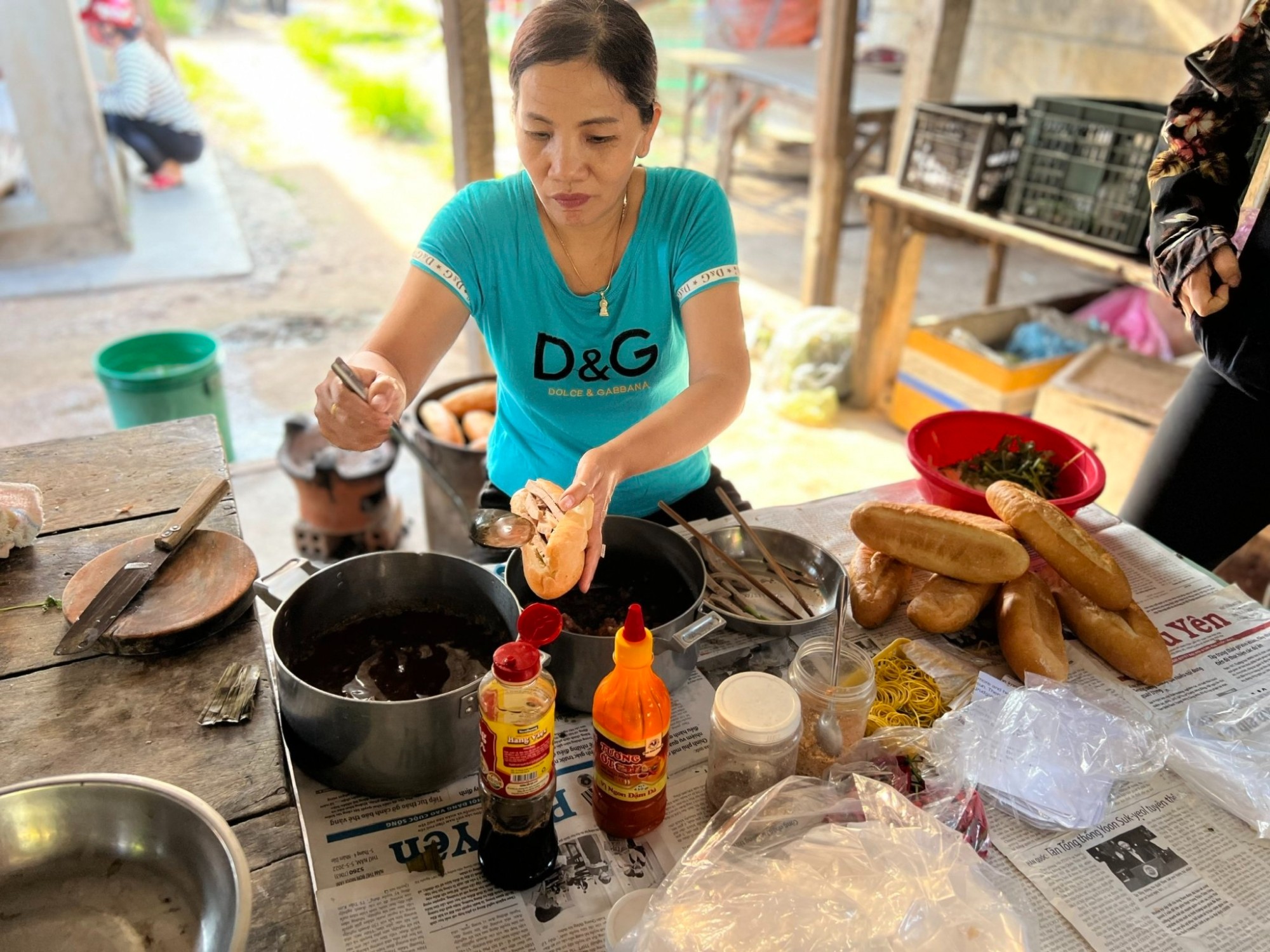 Một ổ bánh mì xíu mại, chả lụa "béo ú", chan nước thịt kho đậm đà được cô chủ quán giới thiệu bằng chất giọng chân chất đặc biệt của người xứ Nẫu "Không đâu có, chỉ ở đây mới có", giá 10.000 đồng/ổ