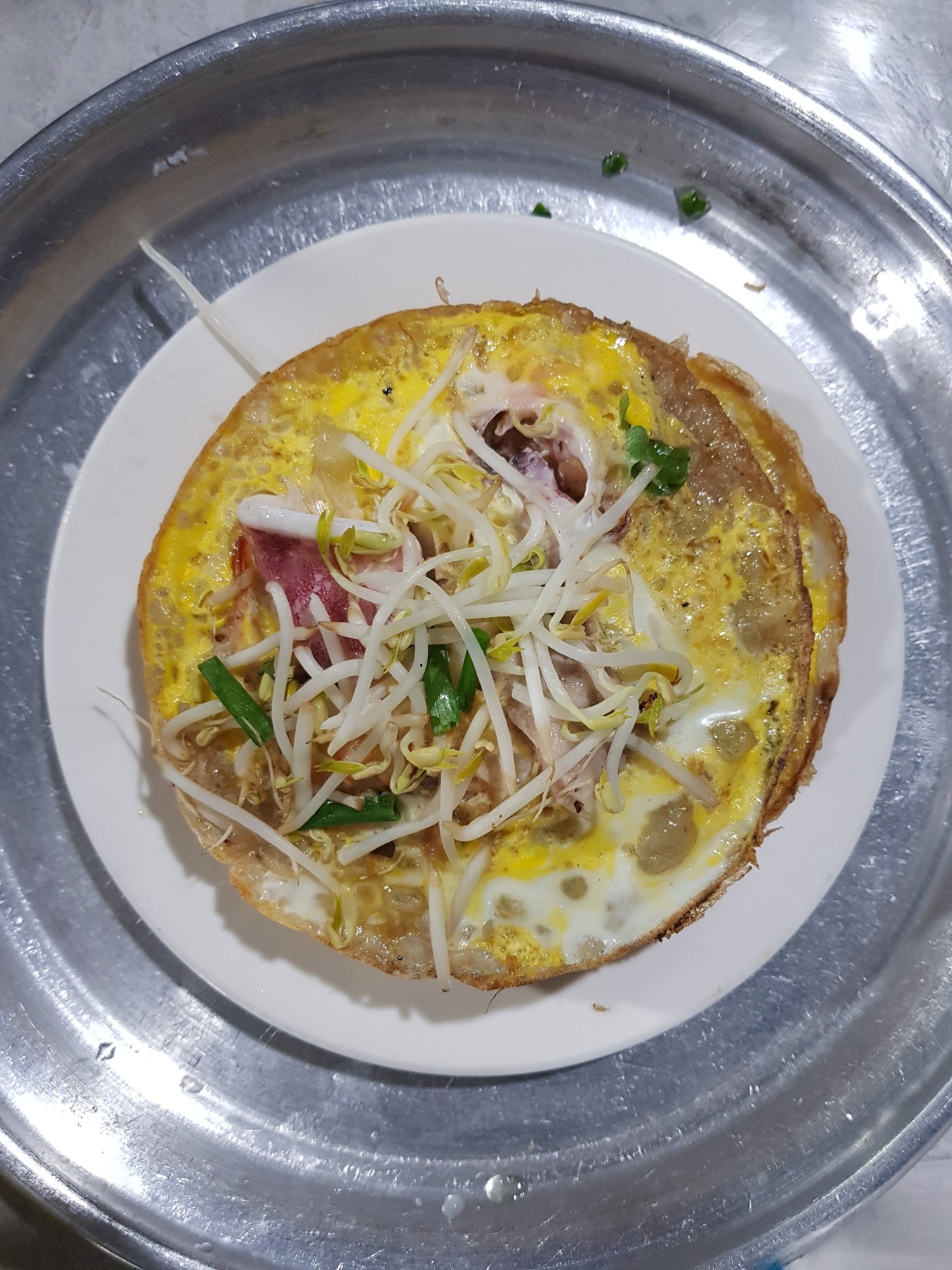 Nếu còn chưa no sau 1 tô bún, tô bánh canh, bạn có thể rẽ qua hàng bánh xèo. Bánh xèo miền Trung nhỏ, vỏ dày hơn bánh xèo miền Tây. Nhân bánh gồm trứng, mực, tôm và giá đỗ. Chỉ 10.000 đồng cho 3 chiếc bánh siêu hấp dẫn
