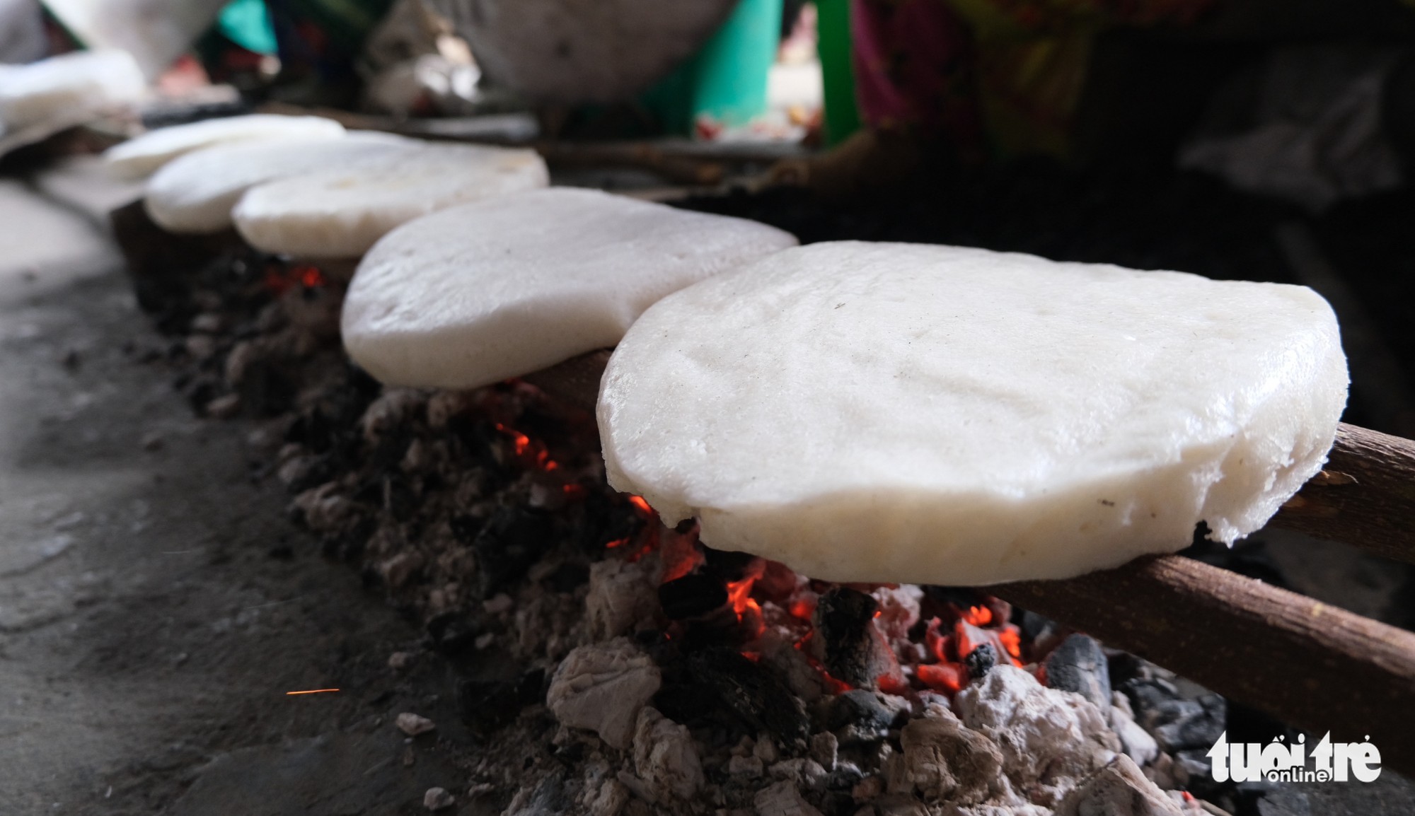 Chốc chốc họ cầm chiếc quạt phe phẩy, quạt than hồng đỏ rực, chiếc bánh trên bếp củi tỏa mùi thơm phưng phức thu hút người dân dừng lại thưởng thức.