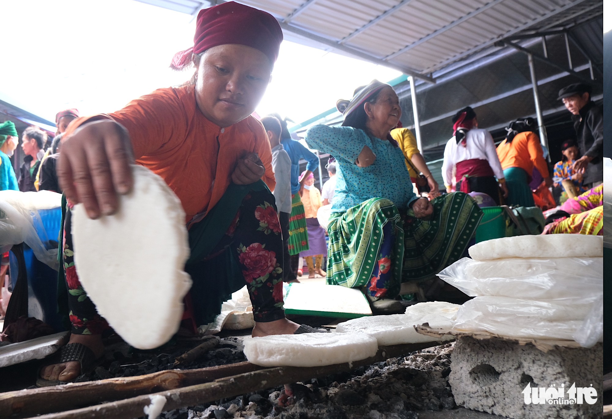 Từ người cao tuổi đến những đứa trẻ mặc váy Mông sặc sỡ, hễ tìm đến chợ phiên là thưởng thức ngay bánh ngô nếp trắng tròn to, dẻo thơm, nóng hổi trên bếp than hồng.