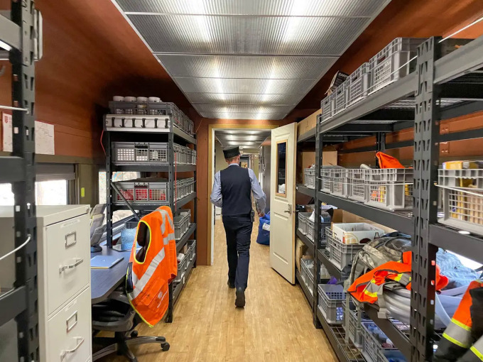 Phòng làm việc của Lucas trong khoang cuối tàu. Ảnh: Insider Kết thúc chuyến tham quan đến hai căn phòng đặc biệt trên tàu, Monica trở về chỗ ngồi của mình tại toa dành cho khách. Cô cho biết cảm thấy may mắn khi được tận mắt khám phá những nơi hầu hết hành khách không có cơ hội ghé thăm.