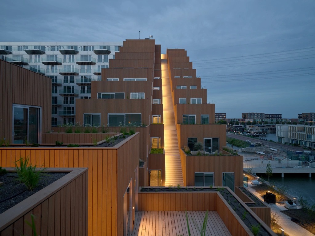 Với sự kết hợp của các loại vật liệu nhôm, kính và gỗ, tòa nhà hiện đại này là tác phẩm được thiết kế bởi kiến trúc sư nổi tiếng người Đan Mạch Bjarke Ingels hợp tác cùng công ty kiến trúc Barcode Architects có trụ sở tại Rotterdam (Hà Lan).