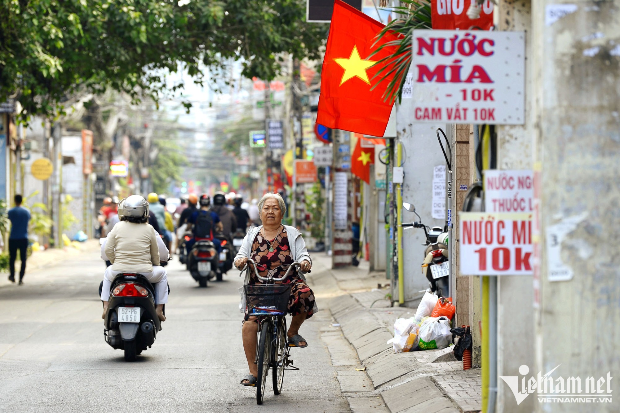 Chỉ sau một đêm, con hẻm nhỏ trên đường Nguyễn Kiệm rực rỡ màu cờ. Từ lâu việc treo cờ Tổ quốc đã trở thành thói quen mỗi dịp lễ, đặc biệt là Tết đối với người dân khu vực này.