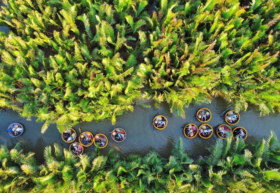 Rừng dừa rộng lớn nhìn từ trên cao. Ảnh: Duy Hậu. Những chiếc thuyền tuy đơn sơ nhưng chắc chắn và an toàn sẽ đưa bạn đi dọc theo cung đường mát rượi trên làn nước trong xanh, hai bên là rừng dừa vươn ra giữa lòng sông, tạo nên khung cảnh miền Tây giữa lòng Hội An.
