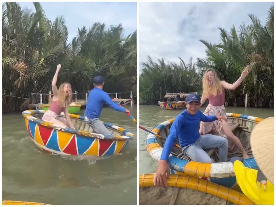 Nữ du khách người Canada, Alex Andria, gọi đây là trải nghiệm "điên rồ" nhất khi ghé thăm Việt Nam. Cô hào hứng chia sẻ đoạn video ghi lại khoảnh khắc "quẩy" nhiệt tình trên chiếc thuyền thúng xoay tròn khiến nhiều người thích thú.
