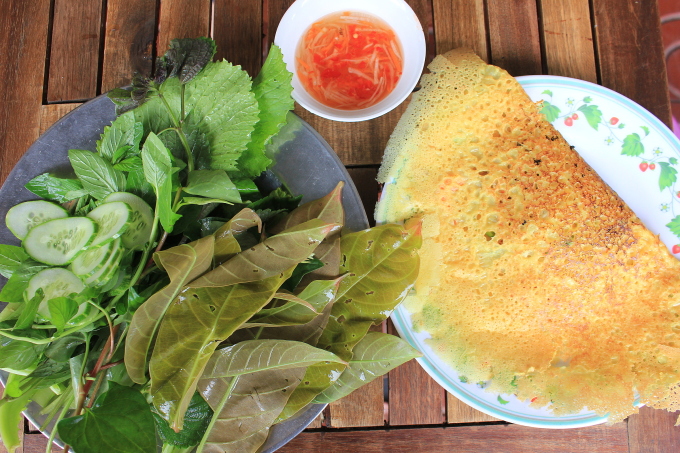 Bánh xèo vàng giòn ăn cùng nhiều loại rau rừng và nước chấm chua ngọt. Ảnh: Hà Lâm Những chiếc bánh xèo vừa chiên xong có vỏ bên ngoài vàng giòn thơm, bên trong đậm vị ngọt từ thịt ba rọi, giá và tép ăn kèm nhiều loại rau rừng. Đặc biệt, rau rừng ở đây được lấy từ nguồn rau sạch và rau thiên nhiên trên núi Cấm có lá của cây xoài, cây cóc, lá cách, lá lốt; rau tía tô, cải xanh; sao nhái, đọt mọt, quế vị, bằng lăng; xà lách các loại...