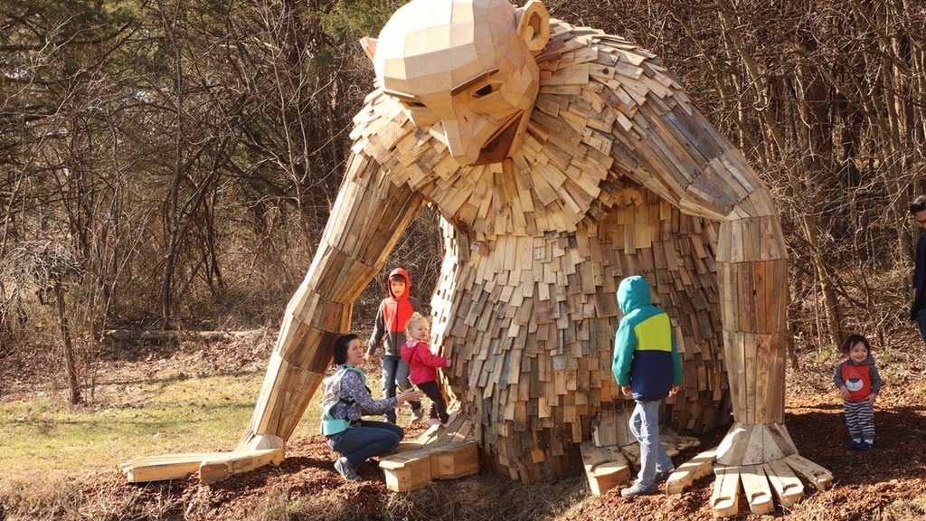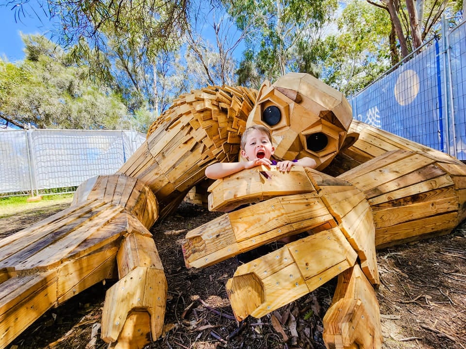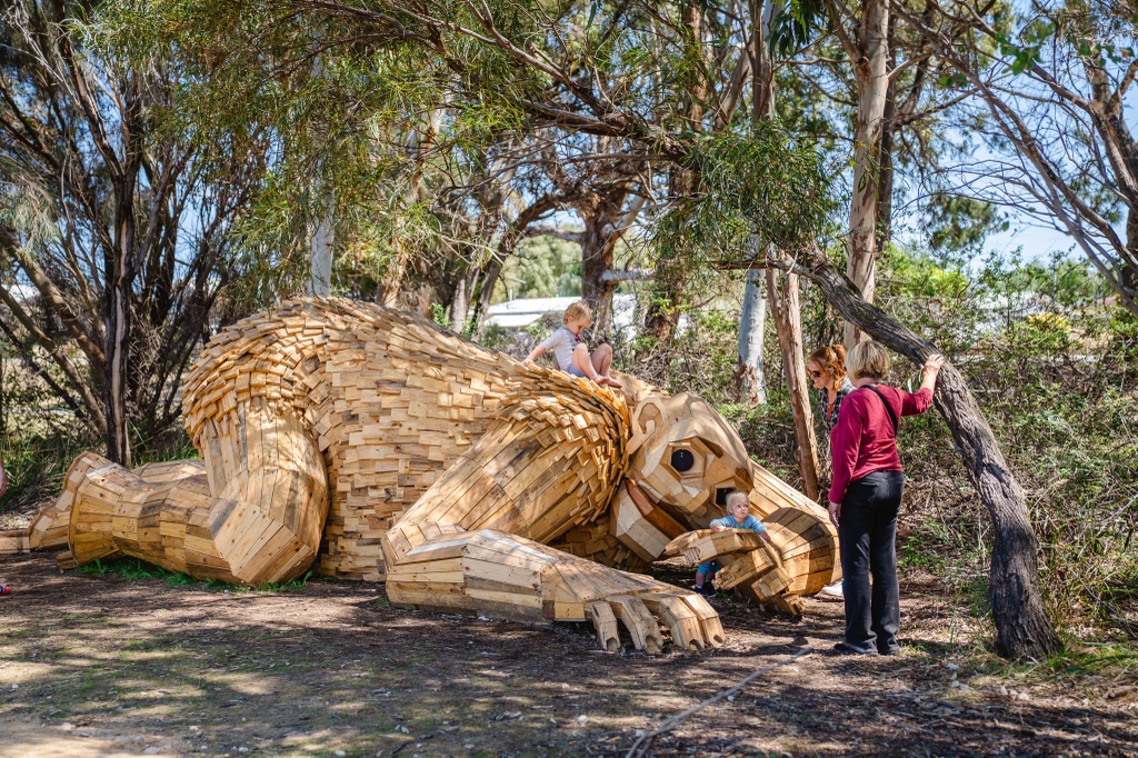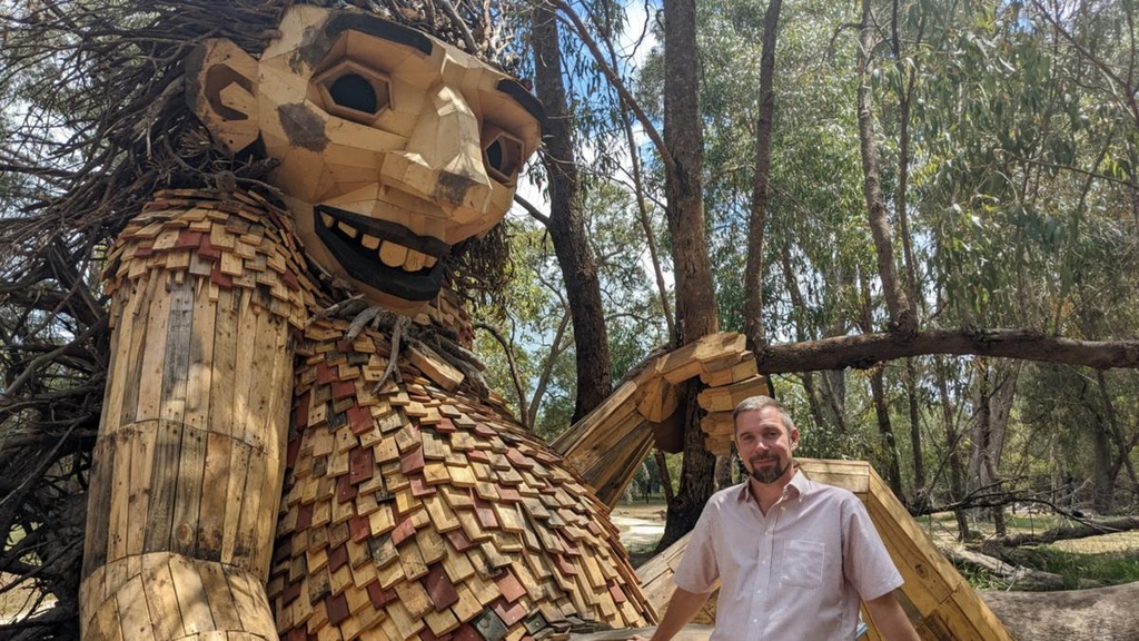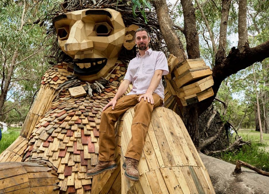 Tác phẩm điêu khắc là một trong sáu tượng người khổng lồ được nghệ sĩ Đan Mạch Thomas Dambo xây dựng một cách bí mật. Chúng được cất giấu trên khắp các vùng Mandurah và Peel, được gọi là "Người khổng lồ của Mandurah". Ảnh: Mandurah Mail.