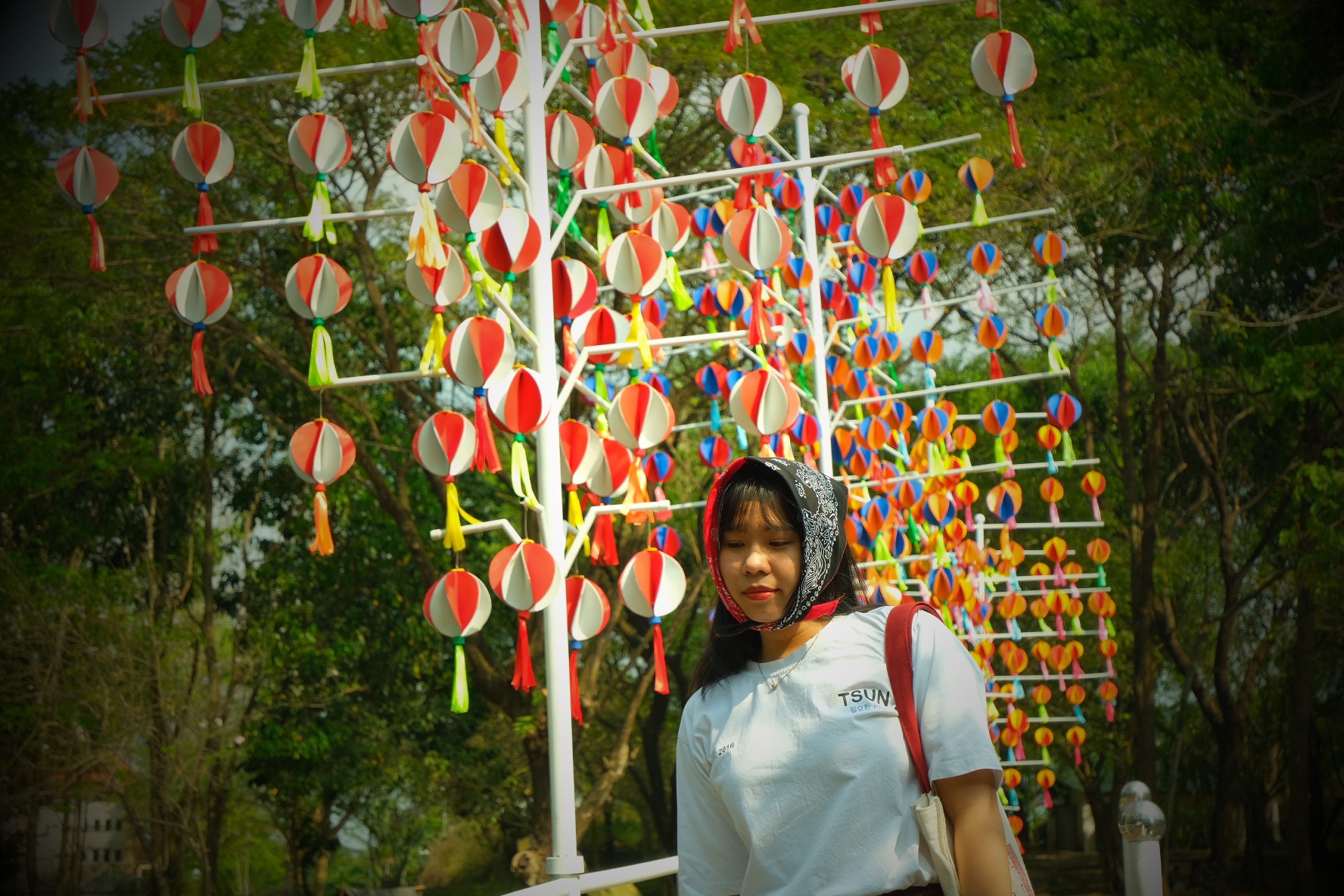 Hàng cây xanh mướt là background tuyệt vời cho bộ hình xinh lung linh