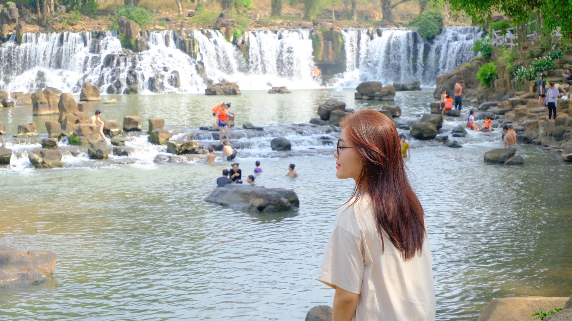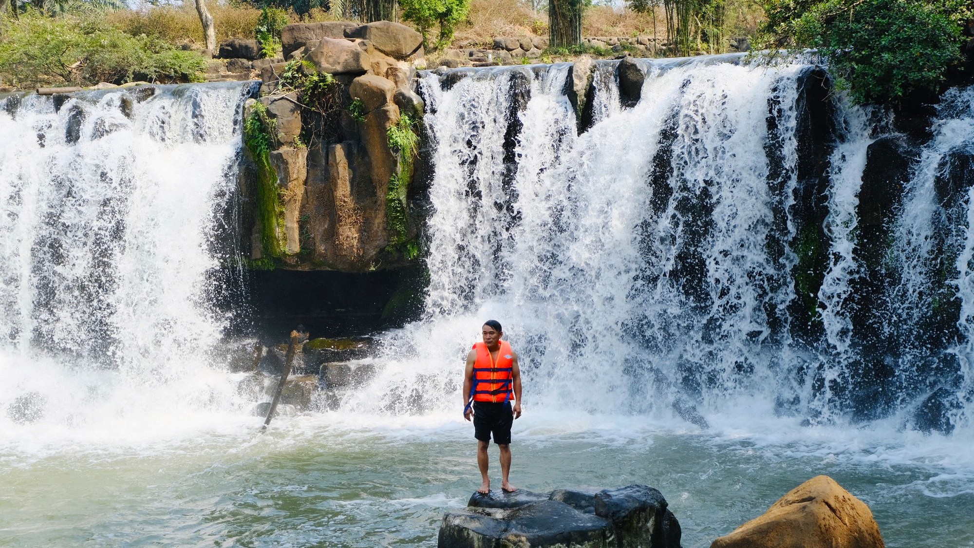 Bạn có thể thỏa sức tạo dáng bên bờ thác hùng vĩ, những dòng nước trải dài chảy xen qua những bậc đá