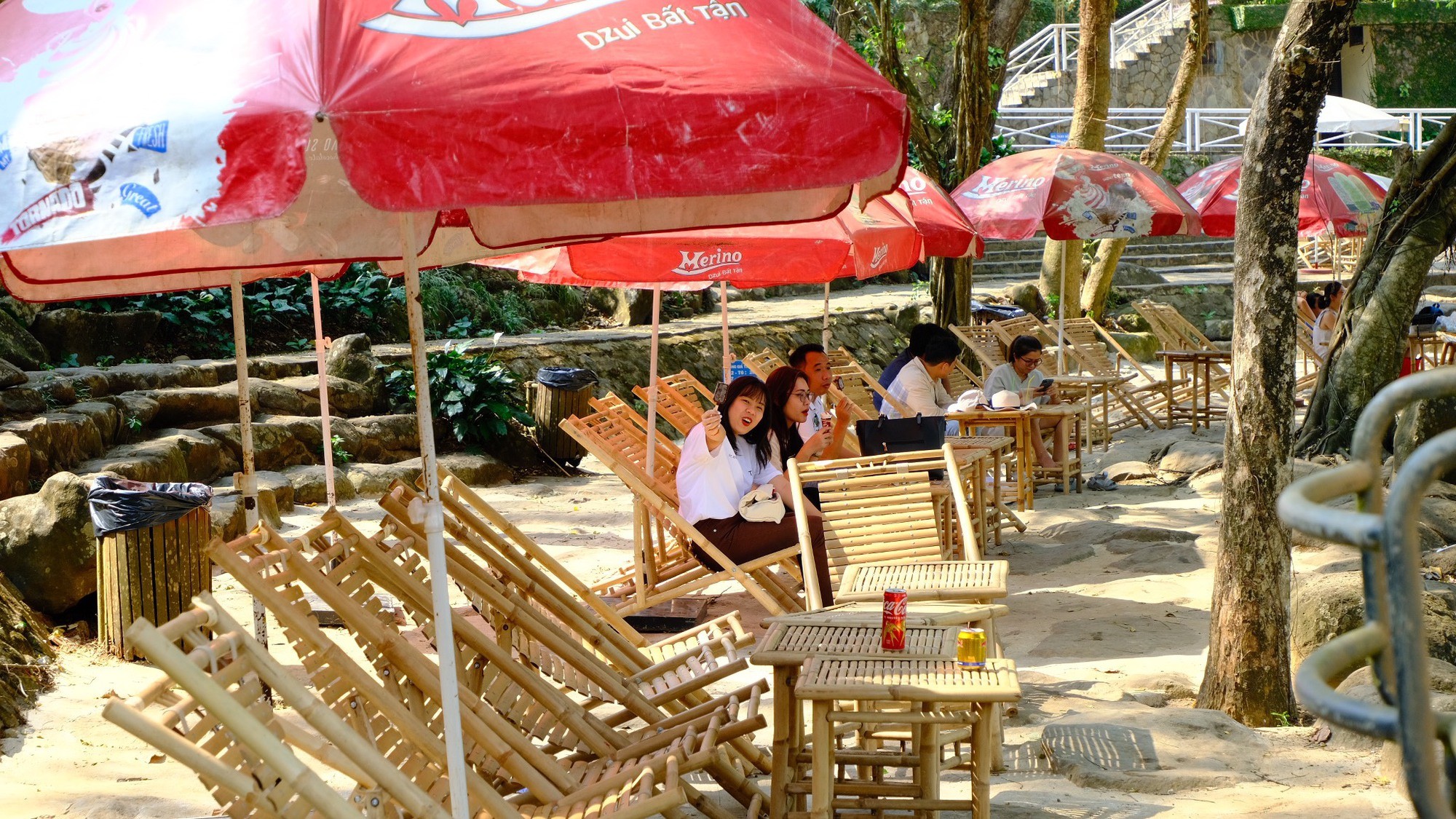 Phía trên khu tắm thác có khu bàn ghế cùng dù để các gia đình nghỉ chờ. Mỗi chiếc ghế có giá thuê 25.000 đồng, không giới hạn thời gian