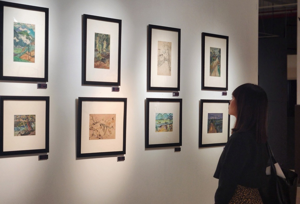 Tranh của của hai thế hệ họa sĩ được trưng bày tại triển lãm. Ảnh Bích Phương. Hành trình của hai họa sĩ ở hai mốc thời gian khác nhau, nhưng tựu trung là những trang nhật ký nối dài của những vùng đất, những câu chuyện thời sự và con người mà họ đã tiếp xúc.